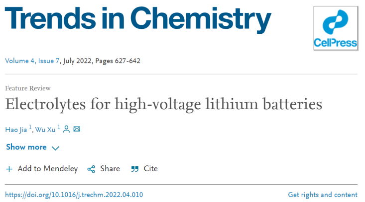 HaoJia, WuXu*, Electrolytes for high-voltage lithium batteries, Trends in Chemistry, DOI: 10.1016/j.trechm.2022.04.010