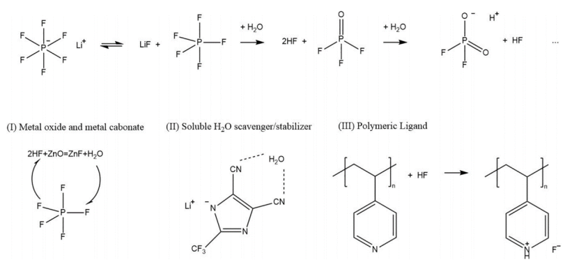图4常规LiPF6-有机碳酸盐电解质中LiPF6与水的反应以及几种HF和水清除剂/稳定剂的工作原理