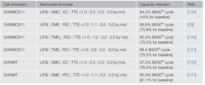 由于拓宽了阳极稳定窗口以及提高了SEI/CEI的形成能力,HCEs和LHCEs比传统的LiPF6-有机碳酸盐电解质更显著提升了高压锂电的循环寿命(表3)。同时,由于LiFSI在大多数LHCEs中被用作导电盐,比LiPF6具有更稳定的化学和热稳定性,因为LiPF6引起或促成的正极材料的过渡金属溶解和表面结构分解得到了有效的抑制。