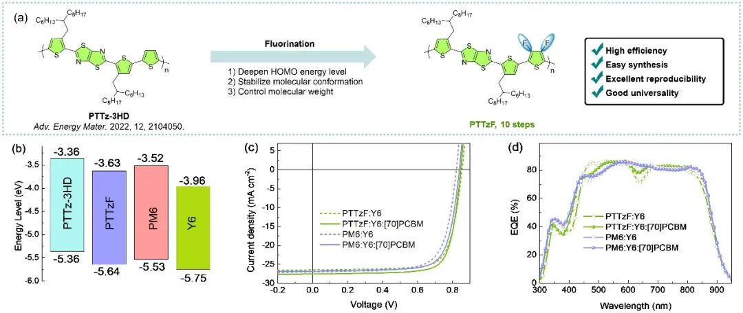 图4. (a)PTTzF的设计思路;(b)聚合物的能级;(c、d)基于PTTzF的OSCs器件的性能。
