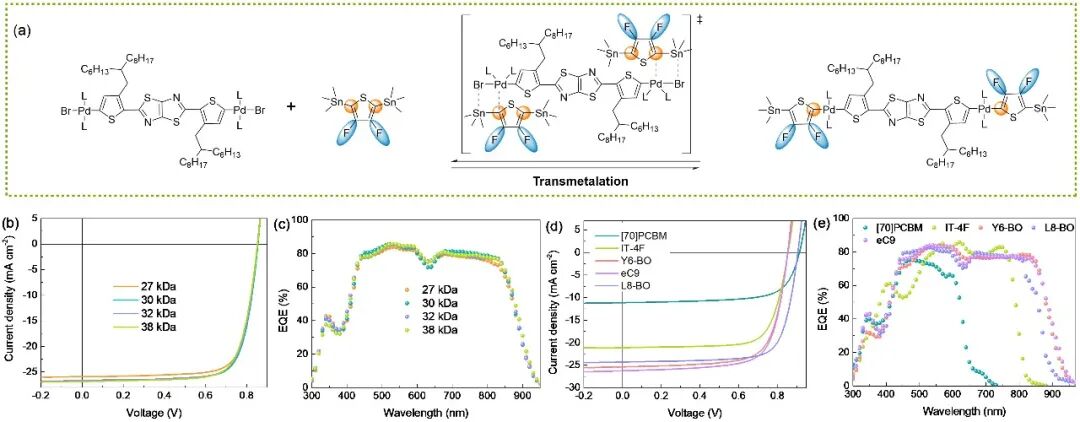 图5. (a)PTTzF分子量稳定的机理;(b、c)不同批次PTTzF的OSCs器件性能;(d、e)PTTzF与不同受体搭配的OSCs器件性能。