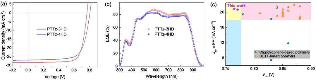 图3. 基于PTTz-3HD和PTTz-4HD的OSCs器件性能。