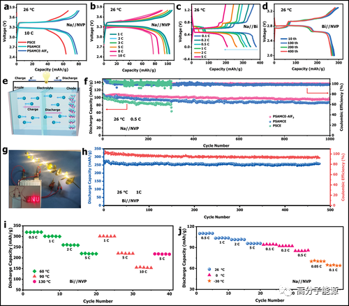 离子与官能团的相互作用及不同电解质的电化学性能分析。PSAMCE的FT-IR光谱为a) wcO振动和b) npr和H振动。c)对称Na//PSAMCE//Na电池的计时安培曲线(插图为极化前后的交流阻抗谱)。d)对称Na//Na槽中各种电解质的电化学阻抗谱(EIS)。e)不同电解质的线性扫描伏安曲线。f)随着电流密度的逐步增加,各种Na//Na电池的电压-时间曲线。g)对称Na//PSAMCE//Na电池电镀/剥离在1ma cm−2处的电压-时间分布。h)对称Na//PSAMCE-AlF3//Na电池电镀/剥离在1和2ma cm−2时的电压-时间分布。