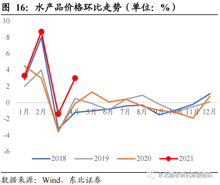 其余分项中,羊肉、水产品价格由3月环比下跌转为环比上涨,且略强于季节性。其中水产品价格的环比上涨幅度为3.0%,与供给减少及饲料成本上涨等因素有关。粮食、食用油价格继续保持小幅上涨的趋势,其中食用油价格环比涨幅明显强于季节性。