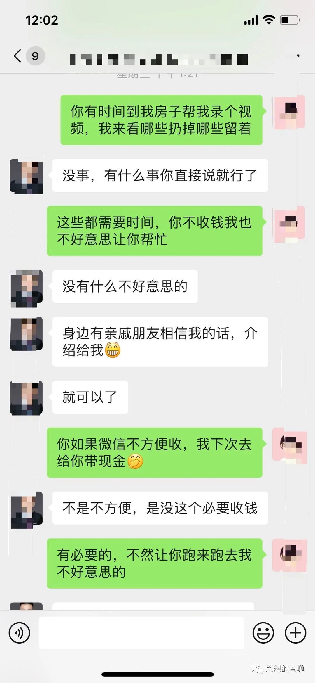 这样的小事,不需要刻意记住,它就存在相关人的脑海中,不论是否与我有关,人们体现出的善意都是让人感动的。这些温暖的记忆碎片,积累起来,终有一天能帮助你对抗生命的中的寒冷和孤独。最近我本来打算出售一套小房子,中介的小伙子积极的帮我带人看房。可是后来因为我自己想过去住,又跟中介说我不卖了。这个小伙子一直以来都认真负责我的房子,有什么事情都会第一时间通知我。我不卖了,他也毫无怨言,将我房子信息从网上撤下。这个房子离我有点远,我想在原来基础上再装修一下,又没办法及时过去开门。于是我给这个中介小哥转了几百块钱,想让他帮我跑跑腿,帮我开门接待一下测量的人,还要处理原来的一些旧家具。这个小伙子就是不肯收我的钱,只是说帮忙没问题,钱不要。说有朋友买房卖房介绍给他就行。处理旧家具的几百块钱还让收废品的人加我微信直接转给我。按理说他并没有赚到我的中介费,还白白带人看房那么久,我说不卖就不卖了,他应该很沮丧。可是他什么都不说,也不肯收我的钱。![]()