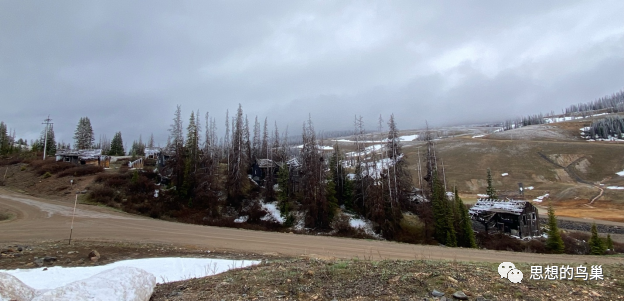 回程路上,蜿蜒的山路,引着我们翻过另一座山,一路盘旋至山顶小镇(Summitville)。十九世纪的淘金时代,这里曾经热闹过好些年,如今,繁华落尽,只剩下当年矿工们的房屋,在阴郁低沉的苍穹之下,孤零零地寂寞相望,守护着一个传说。
