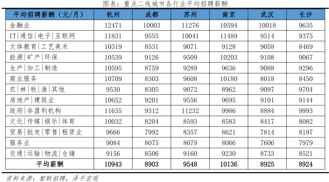从来源看,人才向武汉流入的前十大城市分别为北京、石家庄、深圳、郑州、上海、西安、长沙、广州、黄冈,合计占比达38.3%,高于2020年的37.5%。人才流入武汉原因主要因为2017年开始实施“百万大学生留汉创业就业工程”吸引毕业生,包括给大学生提供低于市场价20%的安居房或租赁房、放宽落户条件、规定指导性最低年薪标准等政策。2021年武汉成立人才集团有限公司,专门为城市引进人才,并且武汉继续放宽落户条件,接近“零门槛”,落户开放度在国家中心城市中最大。作为在校大学生数量全国第三的城市,武汉人才流入明显增加。2021年新增留汉大学生34.5万人,超额完成“学子留汉”工程计划,达到历史最好水平。从去向看,武汉人才外流的前十大城市分别为北京、深圳、上海、广州、杭州、成都、长沙、襄阳、南京、苏州,合计占比达43.9%,高于2020年的42%。6)长沙:2017-2021年人才净流入占比分别为0.0%、-0.3%、0.2%、0.2%、0.04%,占比较稳定,人才流入主因长沙生活成本低、文娱产业繁荣。从人才流入流出看,2019-2021年长沙人才流入占比从1.6%增至1.8%,人才流出占比从1.4%增至1.7%,长沙人才流动性增加,整体人才净流入占比保持稳定,近三年为正。![]()