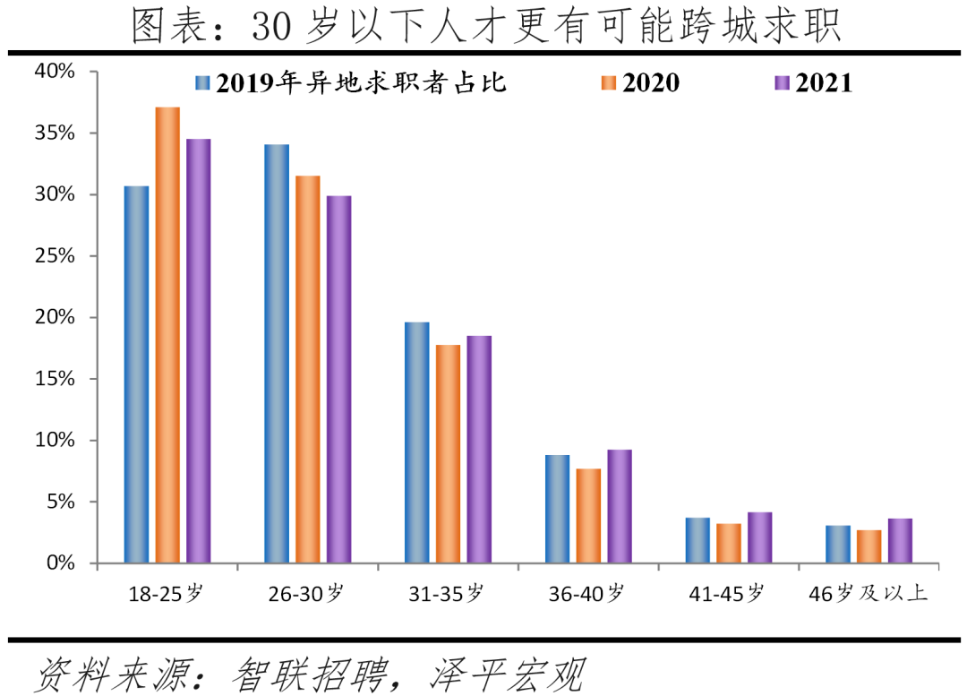 数据说明及特征:智联招聘拥有约2.6亿个人注册用户,月均活跃用户数(含登录、有求职行为的用户)约4632万,其中,求职人才即当年有简历投递行为的用户中约8成以上为专科及以上学历,远超全国就业人口总体的22.1%;在求职人才中,约四成为跨城求职者,即现居住城市和简历投向城市不同的流动人才,2021年跨城求职者比2020年增加7.4%。1)从性别看,2021年流动人才中男性占58%,高于求职总体的53%,男性更有可能跨城求职。2021年求职人才中男女比例为53:47,其中流动人才男女比例为58:42,男性更有可能跨城求职。2019、2020年流动人才男女比例分别为60:40、57:43,求职人才性别比逐渐恢复至2019年的水平。2)从年龄看,2021年流动人才中18-30岁人才占比64.4%,高于求职总体的59.4%,30岁以下人才更有可能跨城求职。2021年流动人才中18-25岁、26-30岁、31-35岁、36-40岁、41-45岁、46岁及以上分别占比34.5%、29.9%、18.5%、9.2%、4.2%、3.7%,各年龄段分别较求职总体高4.8、0.3、-2.8、-1.4、-0.6、-0.3个百分点,说明30岁以下人才更有可能跨城求职。2019-2021年流动人才中30岁以下占比分别为64.8%、68.6%、64.4%,各年龄段流动人才占比逐渐恢复至2019年水平。3)从学历看,2021年流动人才中56%为本科及以上学历,高于求职总体的47%,高学历人才更有可能跨城求职。2021年求职人才中初中及以下、高中、专科、本科、研究生学历占比分别3.6%、7%、42.1%、41.8%、5.6%,其中流动人才各学历分别占比2.3%、4.8%、37.2%、47.8%、7.8%,流动人才中本科、研究生学历比重均高于整体水平,2021年流动人才中本科及以上学历占比55.7%,较求职总体高8.3个百分点。2019-2021年流动人才中本科及以上学历占比分别为50.7%、56.7%、55.7%,流动人才学历占比逐渐恢复至2019年的水平。![]()