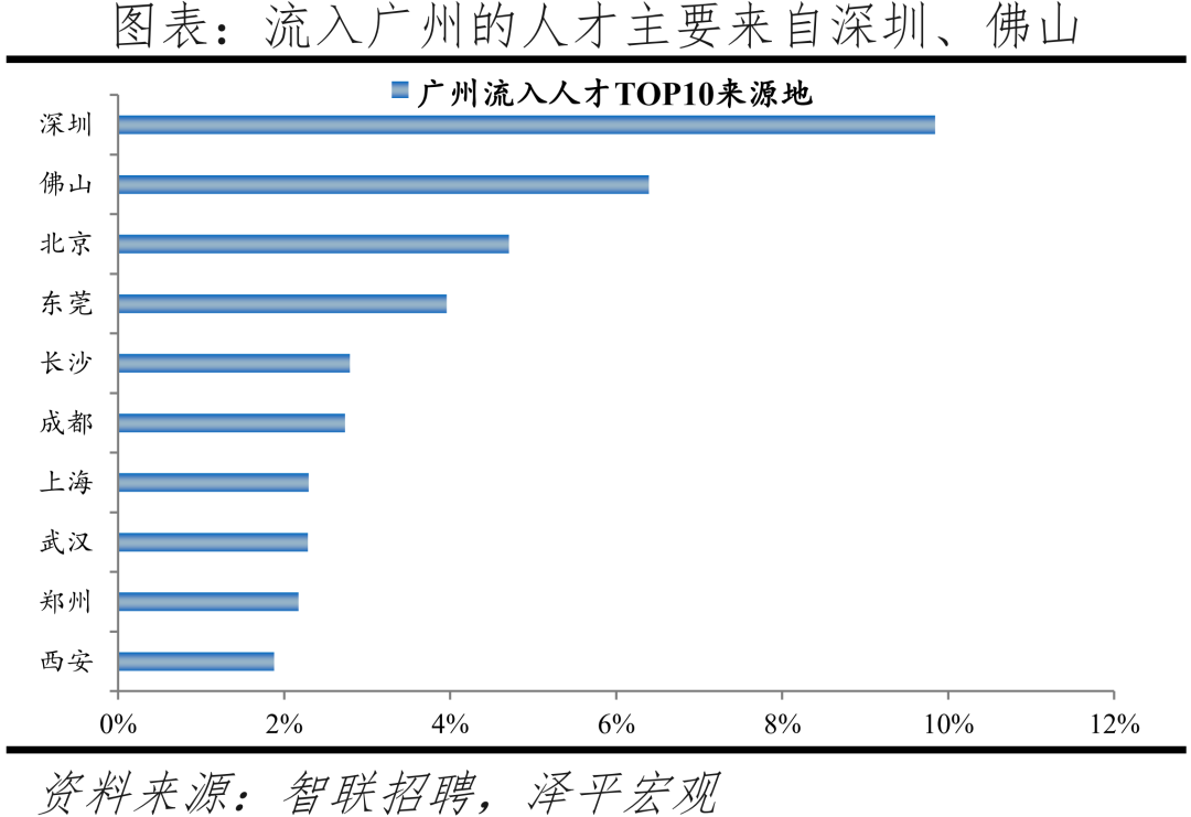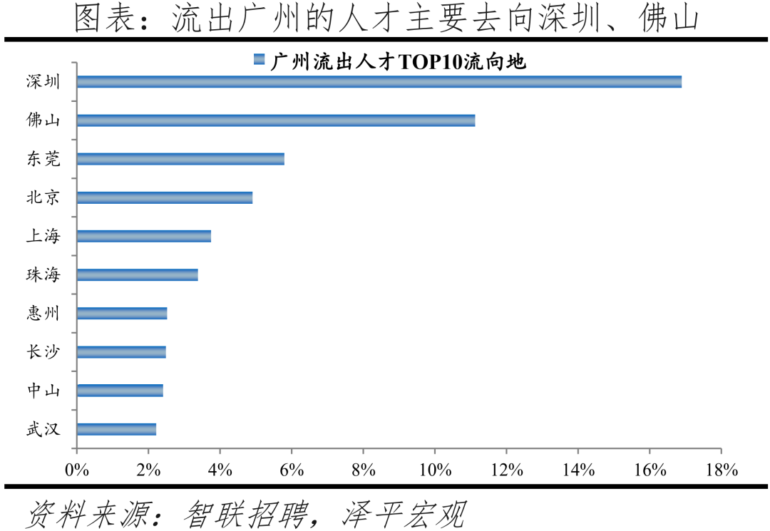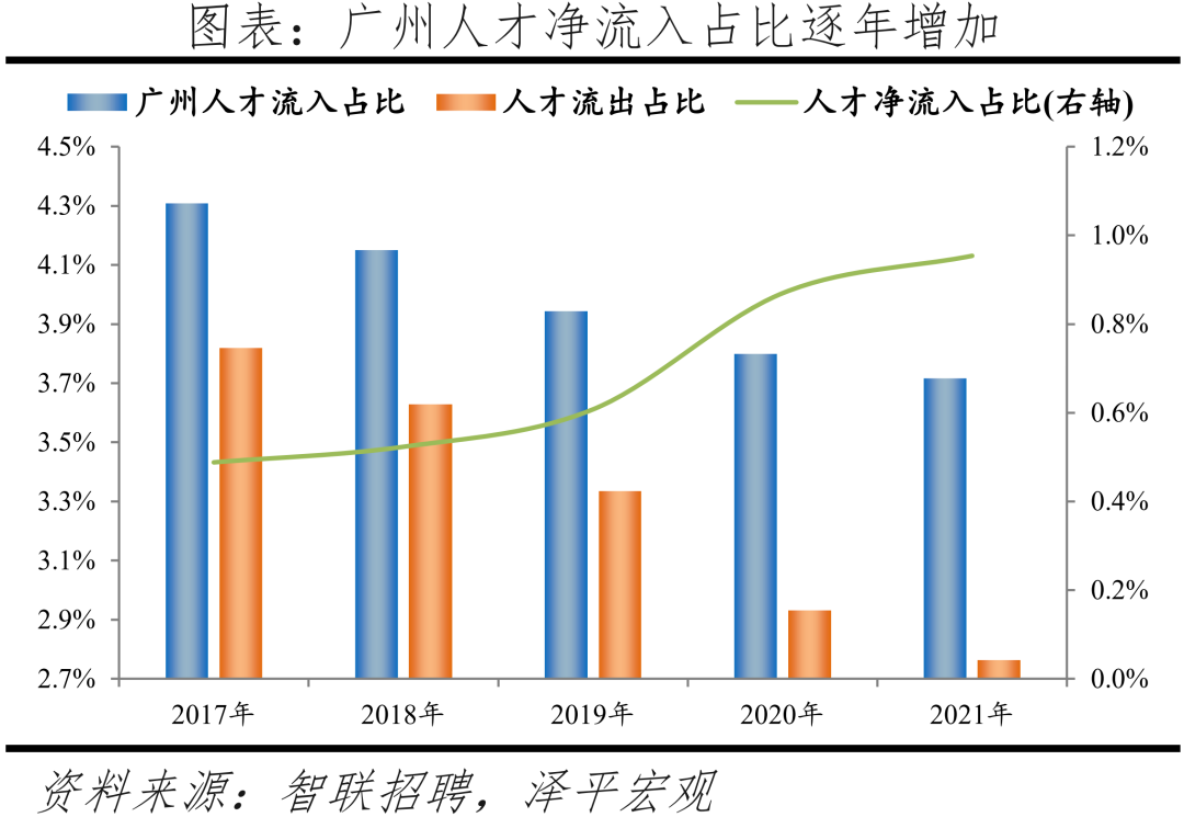 从来源看,人才向广州流入的前十大城市合计占比39.1%,低于2020年前十大来源地的41.0%。其中珠三角城市有3个,合计占比20.2%,占比较去年略有下降。人才流入主因广州经济发展速度快,并且生活成本在一线城市中最低。2021年广州GDP两年复合增速为9.3%,为重点城市中最高。根据英国经济分析智囊机构经济学人智库(EIU)发布的《2019年全球生活成本调查报告》,在全球133个城市样本中,上海与深圳排名并列第25位,北京、广州分别排名49、68位;2020年北京、上海、深圳、广州的房价收入比分别为25.5、19.1、30.6、15.3,广州房价和生活成本在一线城市中最低。从去向看,广州人才外流的前十大城市合计占比55.5%,低于2020年的58.2%。其中珠三角城市有6个,合计占比42.1%。与之相比,北京流出人才中13%流向京津冀城市群,上海流出人才中17.8%流向长三角城市群,深圳流出人才中32.4%流向珠三角城市群。广州人才流向珠三角城市群城市的比重明显更高。一方面是因为珠三角多为粤语城市、文化相近,另一方面是广州高校数量较多,广东省人才为求学向广州集聚,毕业后从广州回流至省内其他城市。根据教育部数据,广州普通高校数、211高校数分别为37、6所,分别排名第5、6名;根据国家统计局数据,2020年广州普通本专科在校生人数为130.7万人、位列全国第一。![]()