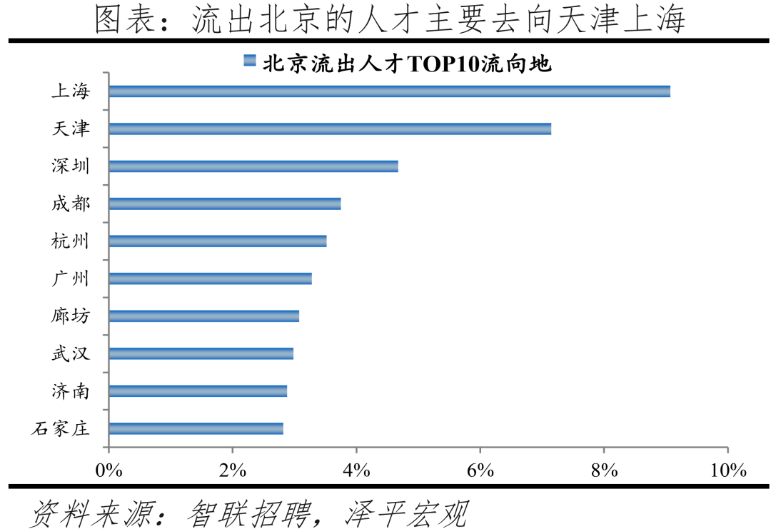 从来源看,2021年人才向北京流入的前十大城市合计占比36%,其中天津占比第一,为7%,北京对周边城市虹吸作用明显。人才流入北京主要因为北京经济体量大、收入水平高,2021年GDP规模达到4.03万亿、城镇人均可支配收入8.15万元,仅次于上海、排名第二。根据智联招聘数据,2021年北京市平均招聘薪酬为12993元/月,为重点城市中最高水平。2021年7月北京人社局印发《北京市引进毕业生管理办法》,适用对象新增“毕业两年内初次就业”的毕业生,同时放宽年龄限制,本科从24岁增至26岁、研究生从27岁增至30岁,人才引进政策明显放松,2021年北京人才流入占比提升。从去向看,北京人才外流的前十大城市合计占比43.2%,高于2020年的42.8%。其中,流出北京的人才中9.1%流向上海,流出上海的人才中9.7%流向北京,北京和上海互为人才外流目标城市的第1位,北京流向上海和上海流向北京的人才在全国流动人才总量中占比分别为0.5%、0.2%,人才从北京净流向上海。北京持续疏解非首都核心功能,与津冀对接协同产业。根据北京市发改委,截至2020年底,全市不予办理新设立或变更登记业务累计达2.34万件,全市累计退出一般制造和污染企业2872家,疏解提升区域性批发市场和物流中心980余个。北京周边城市群人才承接能力则较弱,人才从北京流出的前十城市中津冀城市有3个,仅占13%,低于20年的14.5%。![]()