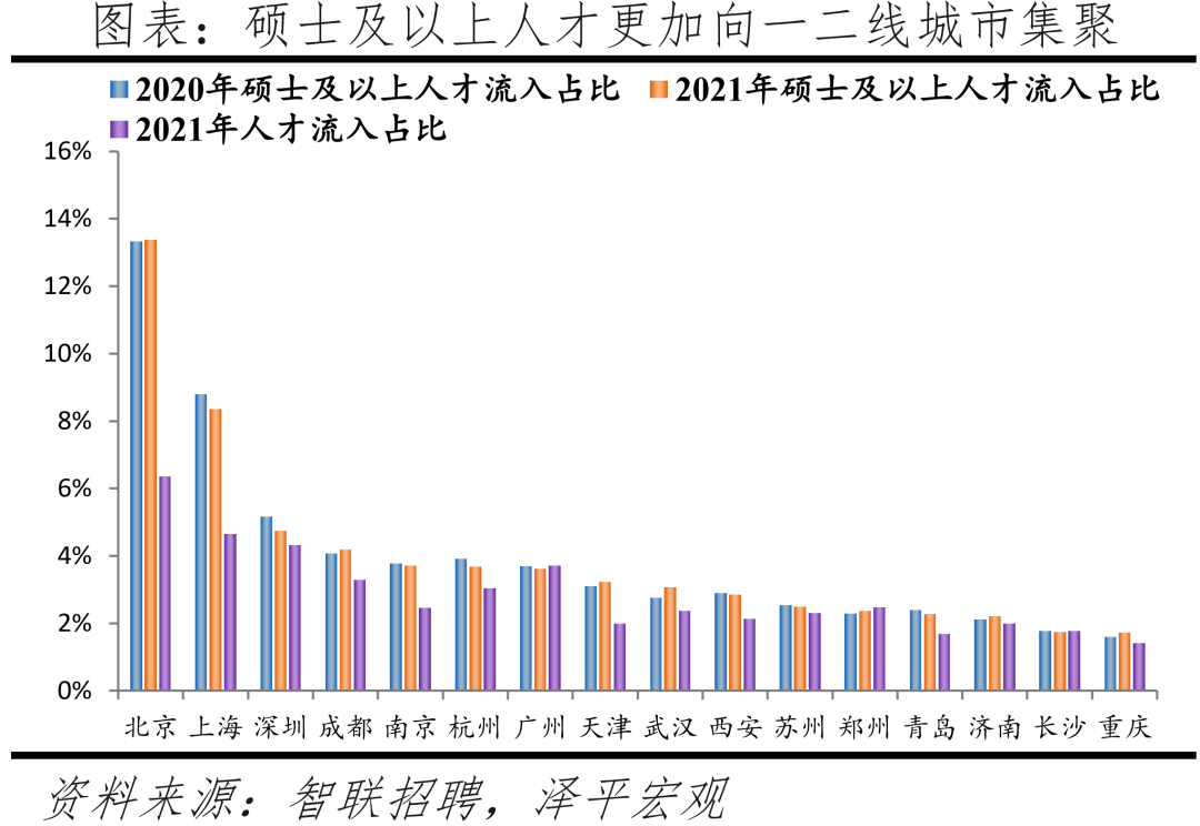 人口是一切经济社会活动的基础,人才更是第一资源。我们在前期系列报告中提出“人随产业走、人往高处走”的逻辑,指出人口正持续向大城市及大都市圈集聚。随着人口红利消逝、人才价值日益凸显,我们已经连续三年与智联招聘合作推出“中国城市人才吸引力排名”报告,以期准确把握人才流动特点、持续跟踪人才流动趋势。数据说明:智联招聘拥有约2.6亿用户,月均活跃用户数约4632万;其中8成以上为专科及以上学历,远超全国就业人口总体的22.1%。在求职者中,约四成为流动跨城求职者,2021年跨城求职者比2020年增加7.4%。2021年流动人才特征逐渐恢复至2019年水平。从性别看,流动人才中男性占58%,高于求职总体的53%,男性更有可能跨城求职;从年龄看,流动人才中18-30岁人才占比64.4%,高于求职总体的59.4%,30岁以下人才更有可能跨城求职;从学历看,流动人才中56%为本科及以上学历,高于求职总体的47%,高学历人才更有可能跨城求职;从工资水平看,流动人才中30%月收入为8K以上,高于求职总体的26.7%,收入较高者更有可能跨城求职;从行业看,流动人才中52%分布在IT互联网、房地产、制造业,高于求职人才总体的49.5%。榜单概览:长三角珠三角人才集聚且流动性下降。1)中国最具人才吸引力城市100强:京沪深居前三。从结果看,2021年北京、上海、深圳、广州、杭州、成都、苏州、南京、武汉、长沙位居前十。2021年应届生、硕士及以上人才将简历投向一线城市的占比为20.7%、30.0%,均高于流动人才流向一线城市占比,应届生和硕士及以上人才更倾向往一二线城市集聚,尤其是硕士及以上人才更倾向往一线城市集聚。2)人才流动趋势:长三角珠三角人才集聚,且高能级城市人才跨区流动性减弱。分地区看,得益于雄厚的经济基础和较高的战略定位,东部人才持续集聚,中部、西部、东北持续净流出。分线看,2021年一线、二线、三线、四线人才净流入占比分别为5.4%、0.4%、-1.0%、-4.8%,受政策放宽影响一线人才持续流入,二线人才集聚放缓、三线较为平衡,四线持续流出。分城市群看,超6成人才流向五大城市群,2021年长三角、珠三角人才持续集聚,京津冀人才净流出趋势放缓,成渝基本平衡,长江中游人才持续净流出。![]()