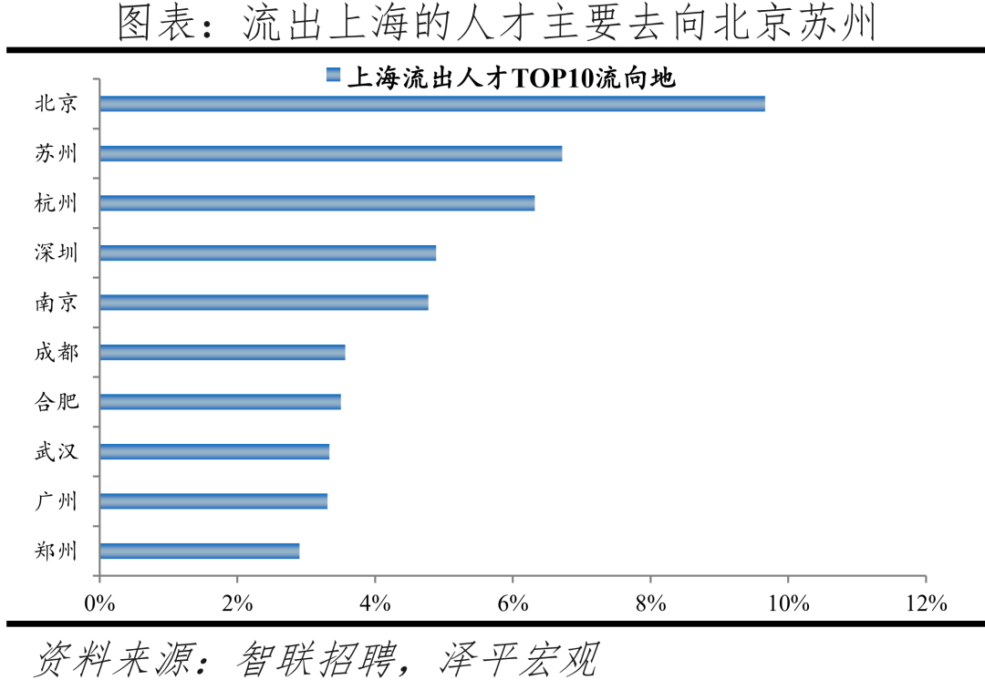 从来源看,2021年人才向上海流入的前十大城市合计占比38.8%,高于2020年的37.8%,上海人才来源集中度有所上升。其中,长三角城市有3个,合计占比10.5%,低于2020年的15%。人才流入上海主要因为上海的经济体量大、薪酬水平高,新经济促进政策初见成效且上海放宽人才引进政策。2021年上海GDP规模超4万亿、人均可支配收入8.2万元,均位列全国城市第一。根据上海市经济和信息化委员会数据,2021年上海的中国互联网百强企业数、企业互联网业务累计收入同比增速分别为20家和35%,居全国各省市第2位和第1位,“在线新经济”发展效果明显。2020年11月新版《留学回国人员申办上海常住户口实施细则》中取消留学生回国后首份工作地不在上海的限制并新增3个留学生激励政策;上海市2021年新版《上海市引进人才申办本市常住户口办法》将人才引进落户通道由16个增加到18个,落户通道明显放宽;在21年底放宽五大新城和自贸区的落户政策,本地应届研究生可直接落户。从去向看,2021年上海人才外流的前十大城市合计占比49.0%,低于2020年的53.3%,流出上海的人才集中度下降。其中,长三角城市有3个,合计占比17.8%,低于2020年的34.6%。人才流出上海主要因为上海控制人口规模和产业转移,2016年上海“十三五规划”及《上海城市总体规划纲要(2015-2040)》均要求2020年及之后上海常住人口控制在2500万人以内。2021年上海人才流出占比明显下降,主因落户政策放宽,包括放松居转户评价标准,张江科学城用人单位引进的人才居转户年限由7年缩短为5年、重点产业的骨干人才年限由7年缩短为3年,2021年上海居转户公示落户人数3.77万人,是2020年的2倍。![]()