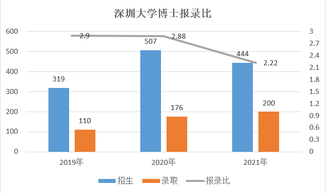 深圳大学2019-2021博士录取人数几乎翻了一倍(110-200),尽管报考人数也有显著增加,但报录比有所降低,证明报考该院校的“上岸”机率有增大趋势;