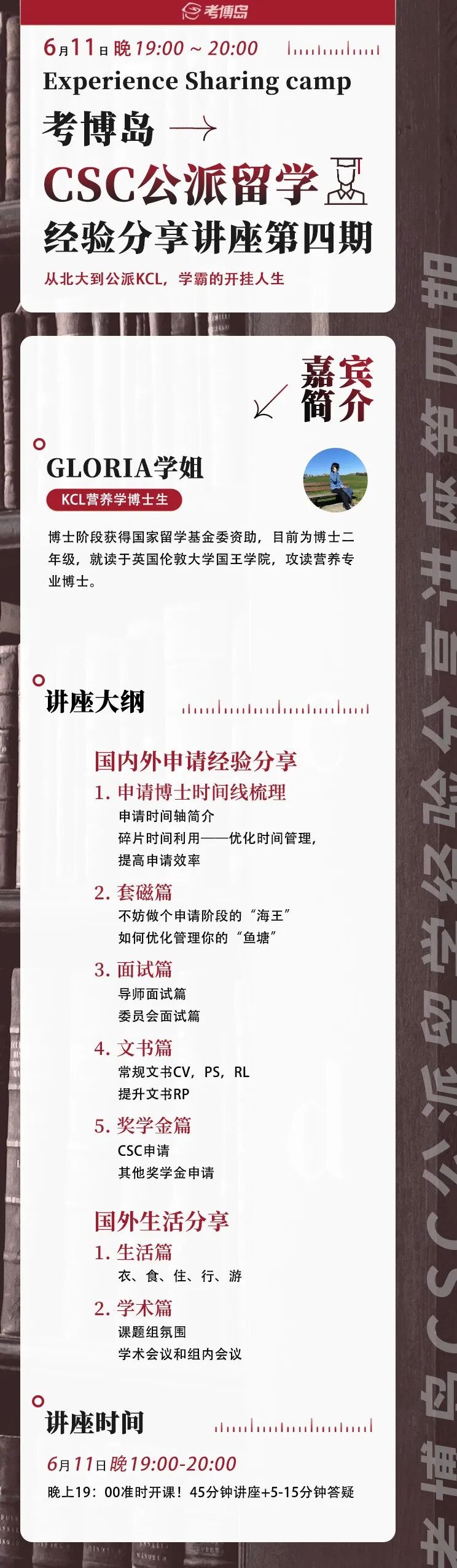 小博特地邀请到了Gloria学姐(KCL营养学博士生)为大家带来公派留学分享第四期——CSC公派英国留学申请经验,帮助大家多国度,全方位了解!对于错过活动直播的同学,以及想要课后重新温习的同学,小博将经验分享专题讲座的视频资料整理好了,并分享给大家,有需要的同学可以后台回复“公派视频4”免费领取学习资料!