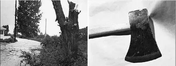 图为被砍后的树桩和砍树的斧头