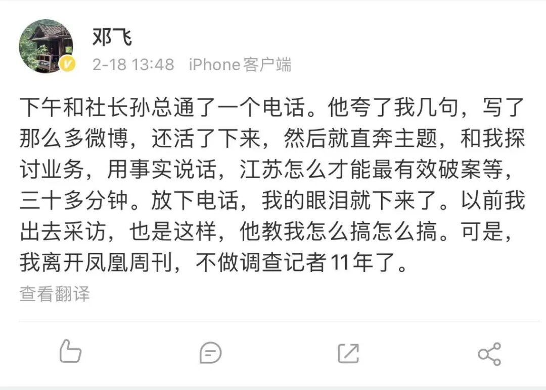 当网友把董某民的结婚照发给邓飞后,邓飞在把信息公布与众的同时,第一时间把获得的材料和信息提供给了江苏省有关当局,这背后的智慧你细品。而这个结婚证可以说是此次事件的关键资料,也是推动事件发展的转折点,之后江苏省委调查组介入,而邓飞本人也表示要协助江苏省委调查组的调查。邓为也提到他之前工作过的《凤凰周刊》老领导对他的关心和爱护,给他打了30多分钟电话,和他探讨业务,如何用事实说话,如何帮助江苏最有效破案。邓飞说他特别感动,放下电话,眼泪就下来了。