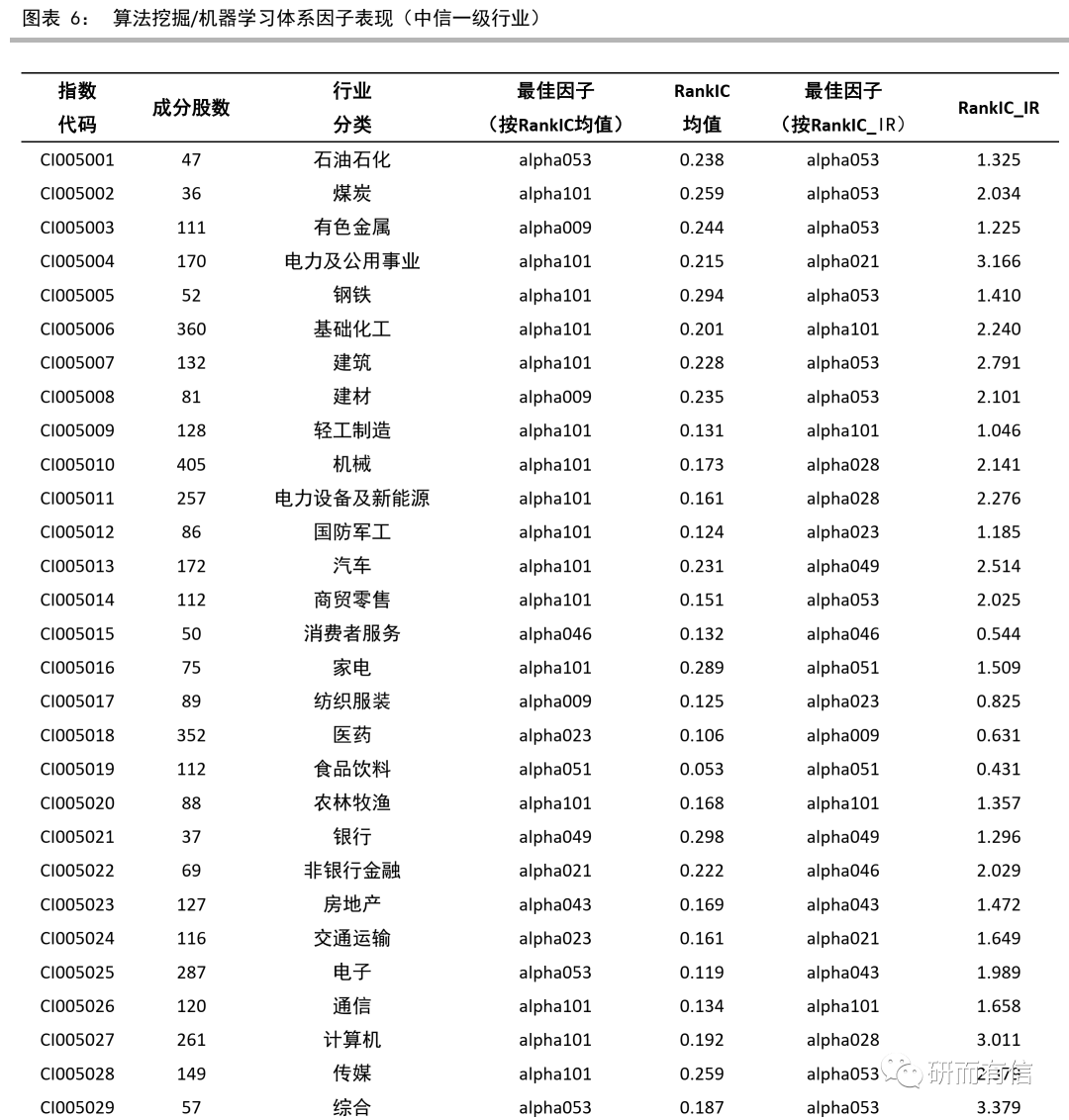 使用中信一级行业分类,本文接着计算基于算法挖掘/机器学习因子体系的单因子RankIC和RankIC_IR值。可以发现,不同行业的最佳因子,无论是按RankIC还是按RankIC_IR,均差异明显。这亦可能是由于不同行业间上市公司本身特质差别较大,将单一因子均匀的应用于全市场选股会具有较大的风险。![]()
