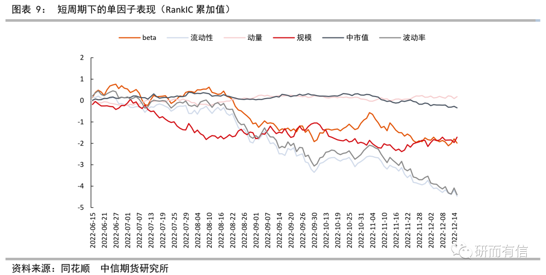 本段按照Barra分类方法,将RankIC值按风格大类进行归类,并在时序上进行累加后取平均数。最近半年的追踪结果显示,中市值因子具有最明显的正向选股能力,流动性和波动率因子具有最明显的负向选股能力,且流动性和波动率因子的负向选股能力比规模因子的正向选股能力更为稳定。上周量价体系中,整体有一定的下行趋势,表明市场风格轮动较快;可基于风格的快速转换配置较佳因子,整体敞口不宜过高。![]()