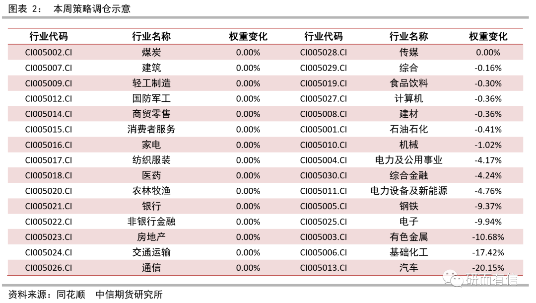 本文基于《行业轮动专题系列八:聚合数据下的周频策略》,计算当周中信一级行业轮动模型的行业配置。本周模型暂不配置任何一级行业,提示市场分歧加剧,短期应谨慎为主,可继续关注行业轮动和变化。