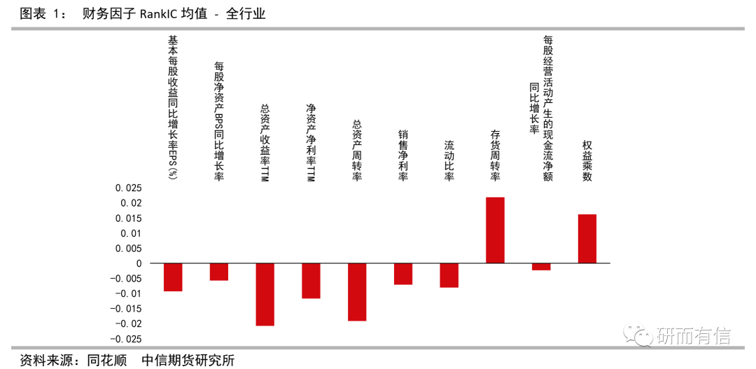 本公众号所推送的内容经由中信期货授权后发布,均为中信期货已公开的信息,不保证文中观点或陈述的完整性、准确性和更新及时性,且不作任何担保。本公众号所推送文章不构成任何形式的投资建议或销售要约,期货有风险,投资需谨慎。本文回顾了上周财务因子、Barra风格量价因子和101算法因子体系中最近一周的单因子表现,同时也跟踪了行业轮动组合的周度表现。上周财务因子多为正向预测因子,选股能力最佳存货周转率呈现正向选股能力。量价体系中,上周量价体系中绝大多因子呈现反向风格,规模因子仍为唯一正向因子,波动类、换手类因子整体表现较好,可适当提升组合在风格因子上的负向暴露,规避主流大类风格,并对RankIC值较突出的因子进行持续配置。