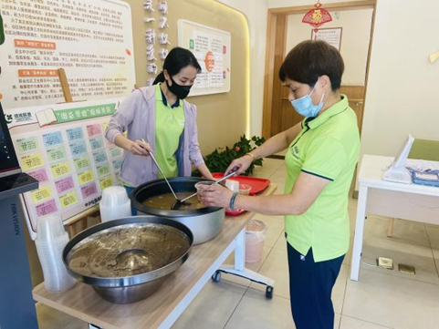 工作人员事先买好了绿豆、冰糖等材料,将绿豆浸泡了3~4个小时。随后将浸泡好的绿豆倒入锅中,等煮熟后放入了冰糖。慢慢熬制,一个个出沙,看着就让人食欲大增。最后在熬制好绿豆汤后,工作人员将清凉可口的绿豆汤送到老人手中,提醒他们注意夏季防暑降温。