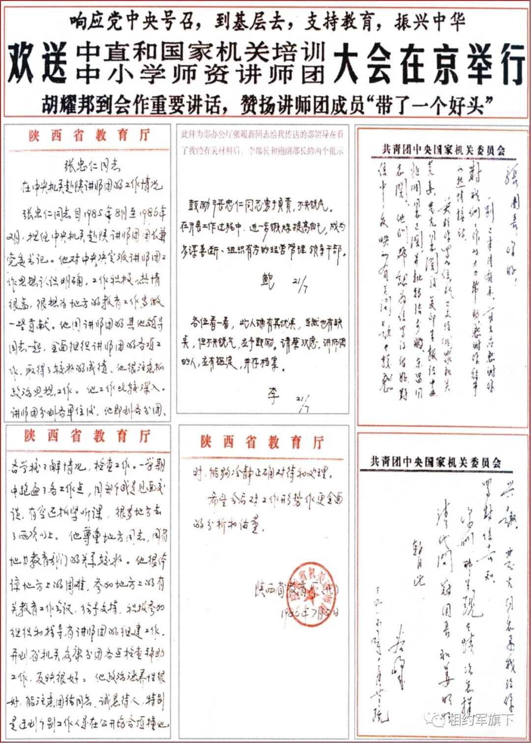 1985年党中央为了贯彻落实教育体制改革的决定,引导全社会关心基层教育,作出了从中央领导机关挑选干部组成讲师团,到基层培训中小学教师的决定。没有教育的普及,就没有现代化的腾飞,我觉得党中央的这一举措,是具有战略意义的大事,因而积极报名参加,并率领136名团员,前往陕西西安、咸宁、延安、渭南、宝鸡和汉中等6个地区开展工作。对我那一段时间的工作,中直机关党委、航天部和陕西省都给予很高的评价。