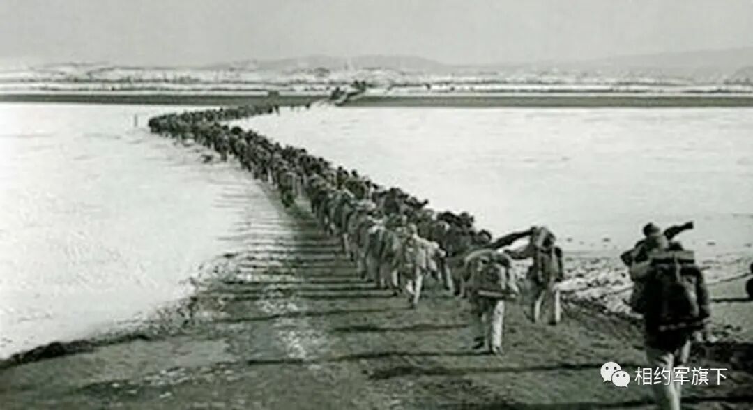 1951年2月15日,64军从安东(丹东)九连城渡口跨过鸭绿江。这张广为流传的志愿军跨过鸭绿江的照片,经查阅了有关回忆访谈资料,才知道拍摄者即是64军政治部摄影组长黎民,正在过江的部队是64军191师572团。