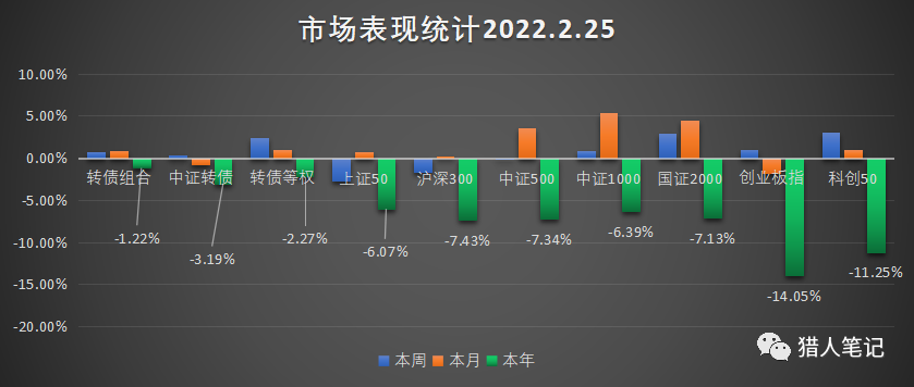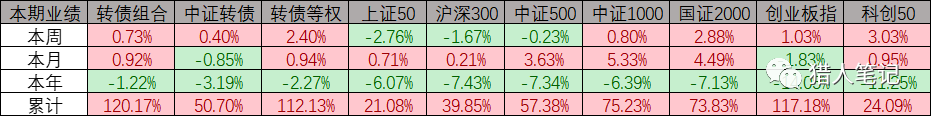 整体来看,大盘股下跌,双创板块反弹,转债微涨。我们的转债组合本周小幅上涨0.73%:
