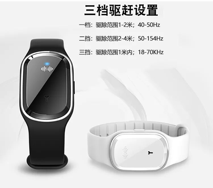 由手环发出特定频率的声音,形成5-7平米的保护范围,高效驱赶身边 70%-80% 的蚊虫。