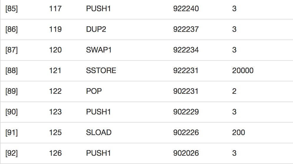 首先每个交易的代码执行量越大,需要的gas就越多。字节码每一个操作都有固定的gas花销。以发币代码为例,如下是以太坊给我发的账单。总共执行了320步字节码的操作。有的操作很便宜,比如压栈(PUSH1),只要3个单位的gas,有的就很贵,比如在区块链上存数据(SSTORE)就一下子花了20,000个单位,而读取数据(SLOAD) 中等, 200个单位。如下加在一起就是1,300,213个单位的gas。只要执行这段代码,就是要这么多gas,好像汽车修理店工时的概念。