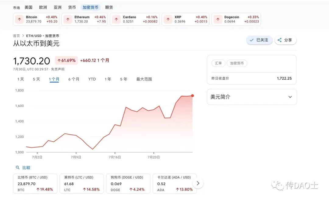(一个月前,BTC & ETH 大跌,史称又一次加密货币寒冬,仅仅一个月之后,ETH 升值60%+;颇有一种打不死的小强之倔强感。)