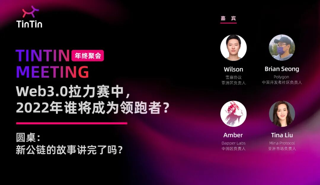 上周,TinTinLand 邀请到了12 个主流公链以及具有代表性的项目,围绕「Web3.0 拉力赛中,2022 年谁将成为领跑者?」话题,一起举办一场盛大的线上直播,在 2022 年 1 月 23 日这天晚上,和大家来一场年终复盘和未来展望。