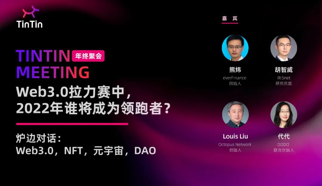 上周,TinTinLand 邀请到了12 个主流公链以及具有代表性的项目,围绕「Web3.0 拉力赛中,2022 年谁将成为领跑者?」话题,一起举办一场盛大的线上直播,在 2022 年 1 月 23 日这天晚上,和大家来一场年终复盘和未来展望。
