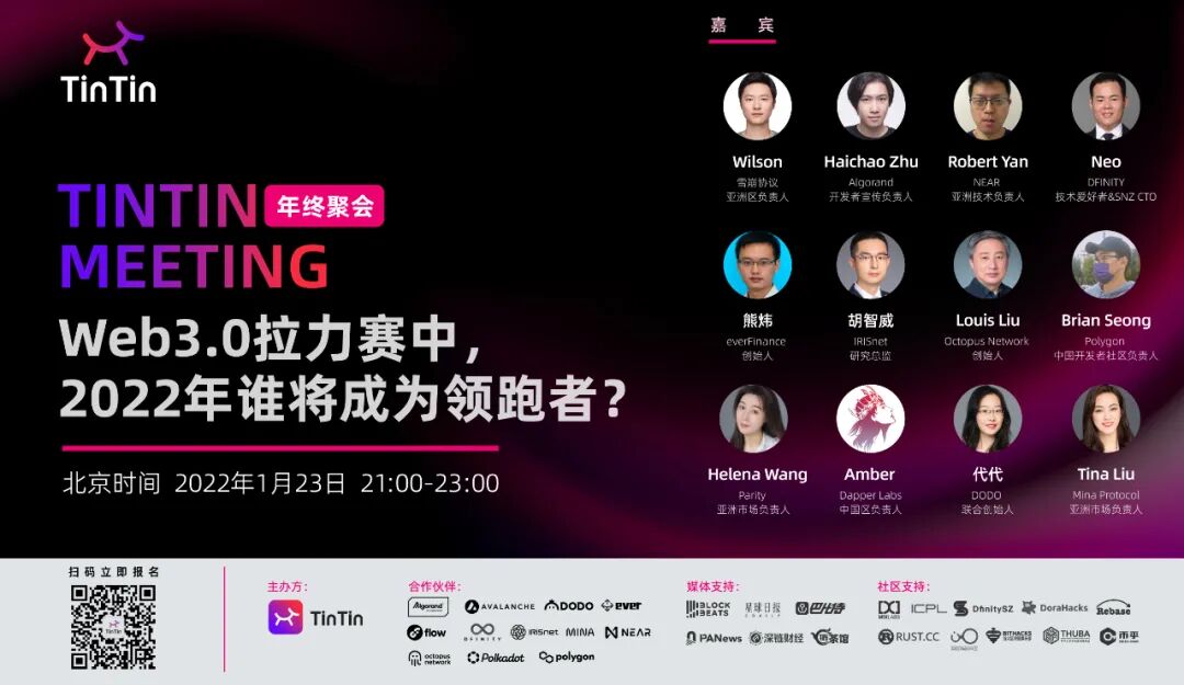 上周,TinTinLand 邀请到了12 个主流公链以及具有代表性的项目,围绕「Web3.0 拉力赛中,2022 年谁将成为领跑者?」话题,一起举办一场盛大的线上直播,在 2022 年 1 月 23 日这天晚上,和大家来一场年终复盘和未来展望。