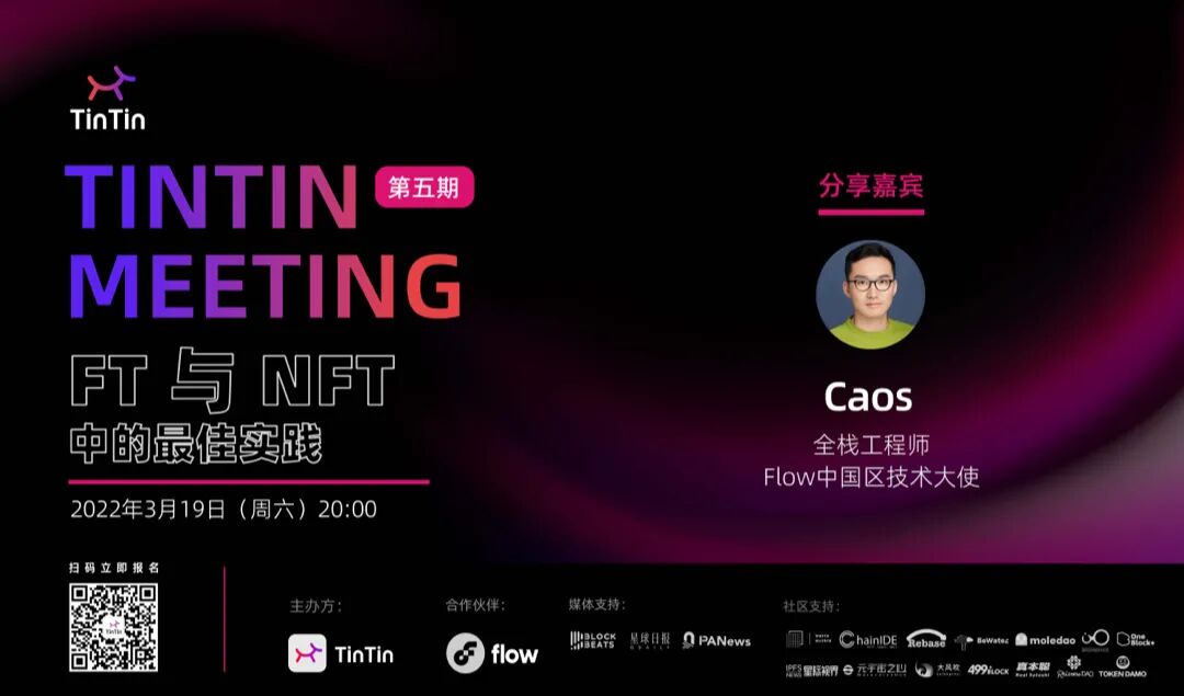 第 5 期的 TinTinMeeting 技术分享主题是「Flow FT 与 NFT 标准中的最佳实践」。分享嘉宾为 Flow 中国区技术大使 Caos,同时他也是 TinTinLand 与 Flow 合作推出的「Flow DApp 开发入门课程—— 从初识 Cadence 到搭建 Marketplace」的课程助教。这次活动吸引了众多对NFT感兴趣的开发者,特别是新手开发者,他们表示从技术层面对于 NFT 和 FT 有了更系统的认知。