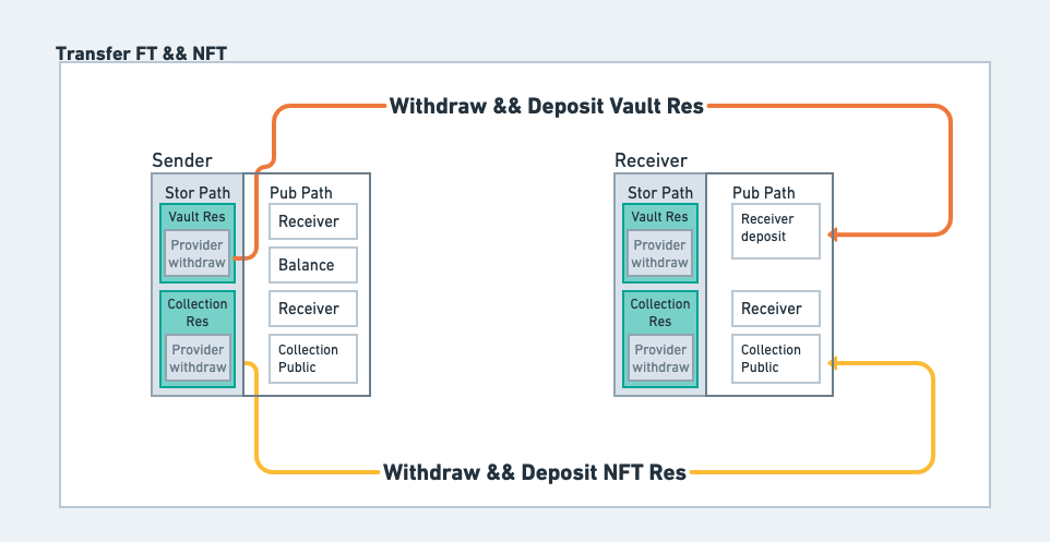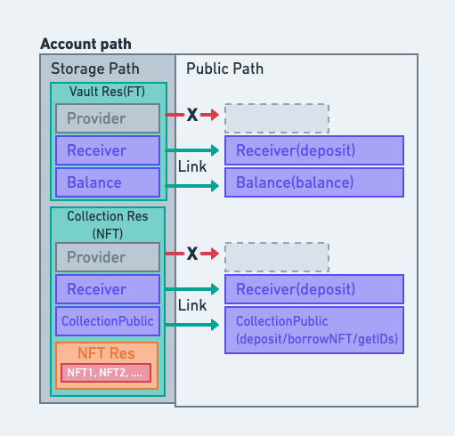 上图中在 Private path 中的资源只允许资源所有人可以访问调用,其中 Vault 资源的 Provider 接口提供了 Withdraw 方法,其他的两种公开的接口 Receiver 和 Balance 则通过 link 方法存储到 PublicPath 中,供外部访问。