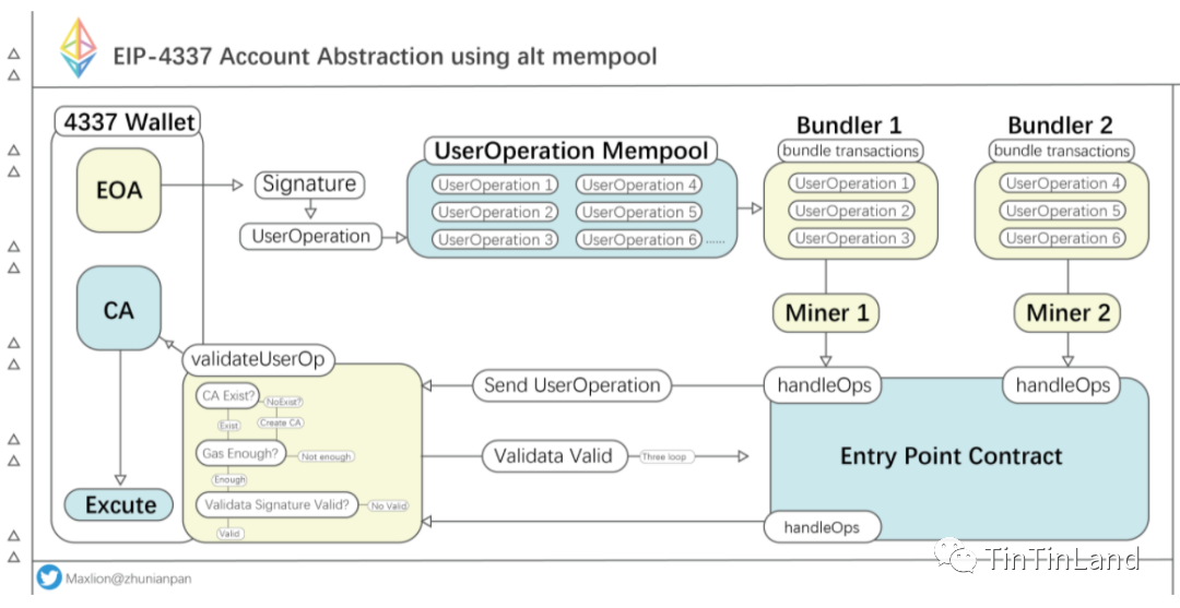 自由实现自定义功能编入的同时,需要多线程架构的兼容支撑才能达到额外的运行要求。对此,EIP 4337 引入了专门针对抽象账户的 User Operations(上文提及的“用户操作”),无论是用于 User Operations 的 Mempool,还是传递 Entry Point 智能合约的 Bundler,都能够实现同时并举,而不会产生高能耗、高费用等额外浪费。如果产生了共识层面改变和网络硬分叉挤兑现象,增加全新的 Mempool 也只需要更新以太坊节点客户端即可。