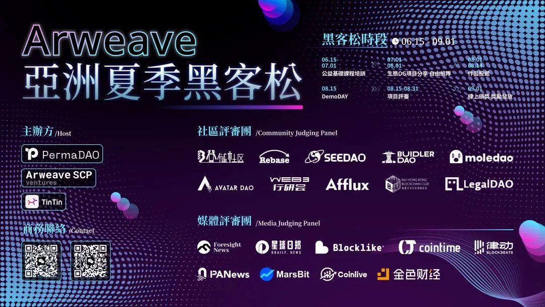 工欲善其事必先利其器,为了给开发者更优秀和丝滑的体验,PermaDAO 将和 Arweave SCP Ventures 以及 TinTin 联合举办《Arweave 亚洲夏季黑客松》,将在 6 月 15 到 9 月 1 号的两月半持续进行。