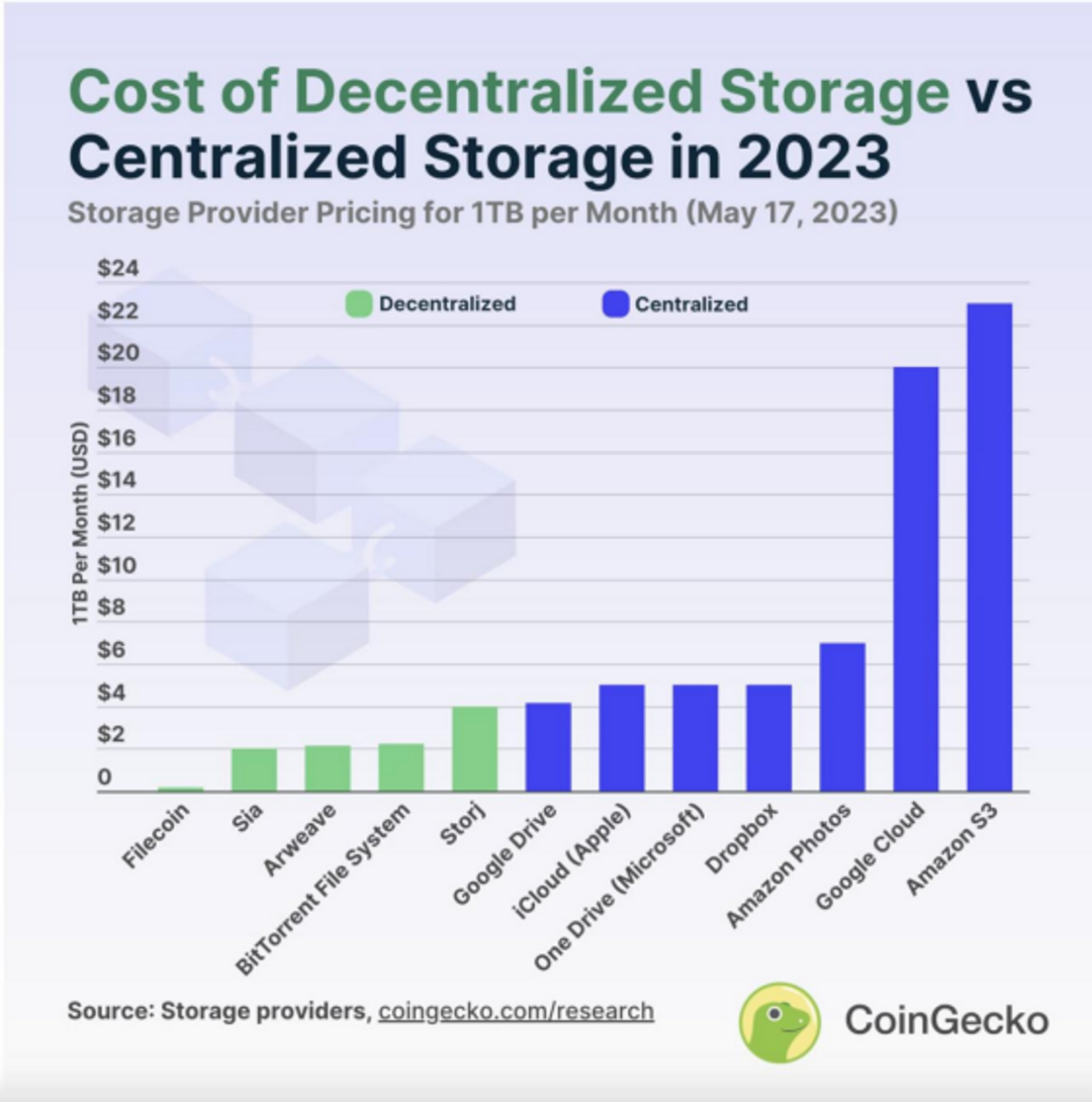 随着时间的发展,去中心化存储的价格问题在稳步得到解决,根据 CoinGecko 的数据,目前的去中心化存储相较于中心化存储便宜了大约 78.6%,以 Arweave 为例,其存储 1TB 的价格仅需要 2.13 美元,大约只有 Amazon S3 的十分之一。