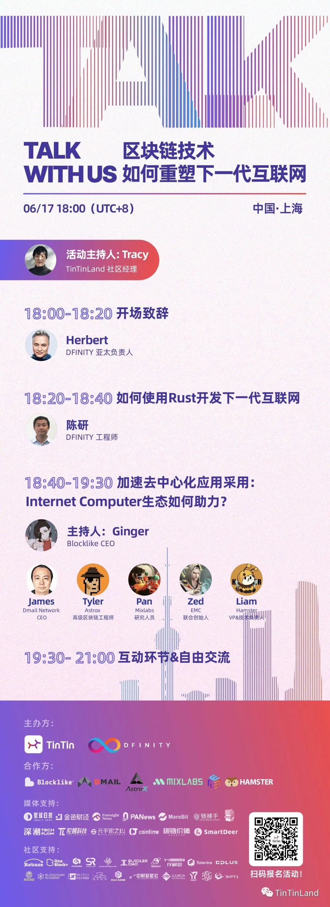 正所谓“群策屈群力”,由 TinTinLand 和 DFINITY 联合举办的线下活动“TALK WITH US:区块链技术如何重塑下一代互联网”将邀请加密行业一众优秀的项目方嘉宾,带来精彩的分享。DFINITY 以构建“互联网计算机”为宏大愿景,旨在解决传统互联网系统安全性差、互联网服务被垄断等问题,以建立一个能够承载几乎任何规模的应用的全新的互联网。而 TinTinLand 作为开发者社区,希望为社区小伙伴们提供更多元丰富的加密发展视角与学习机会。在本场活动中,我们欢迎所有对区块链技术感兴趣、有热爱,并希望在行业中有所建设的小伙伴们参加。