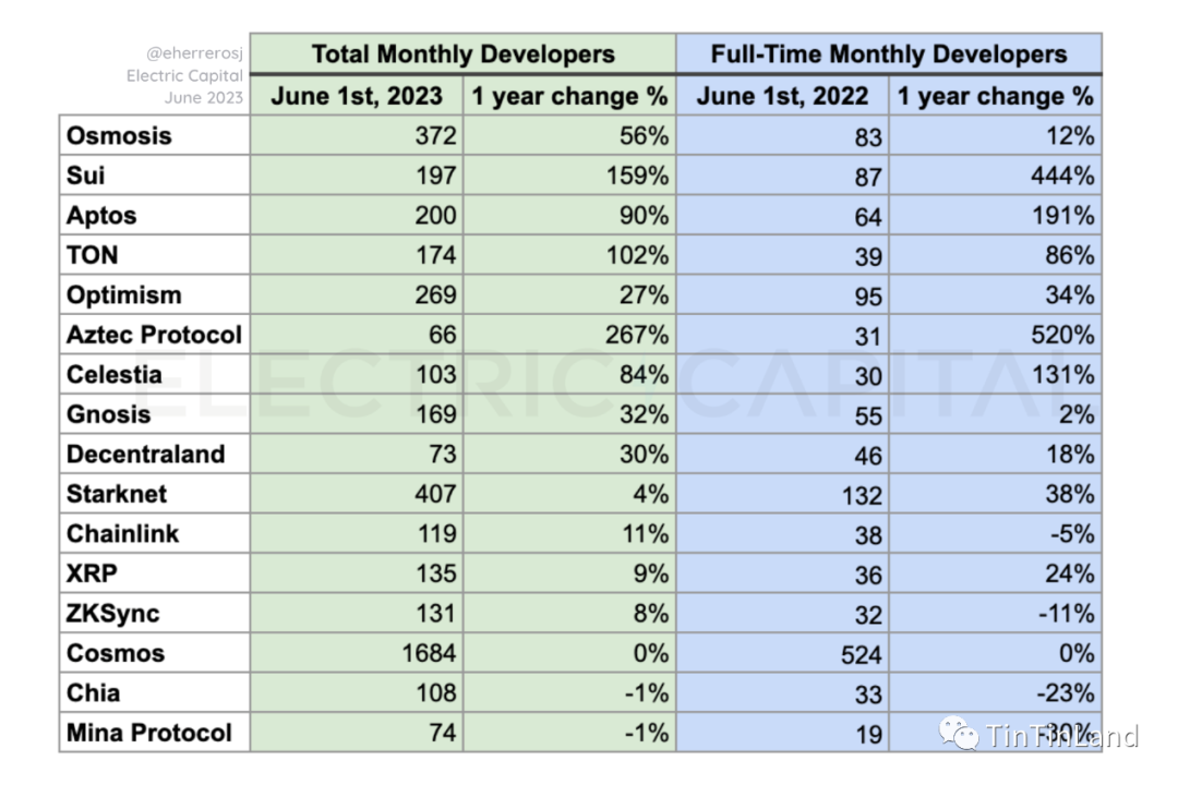 Osmosis、Sui、Aptos、TON、Optimism 和 Aztec Protocol 同比增长