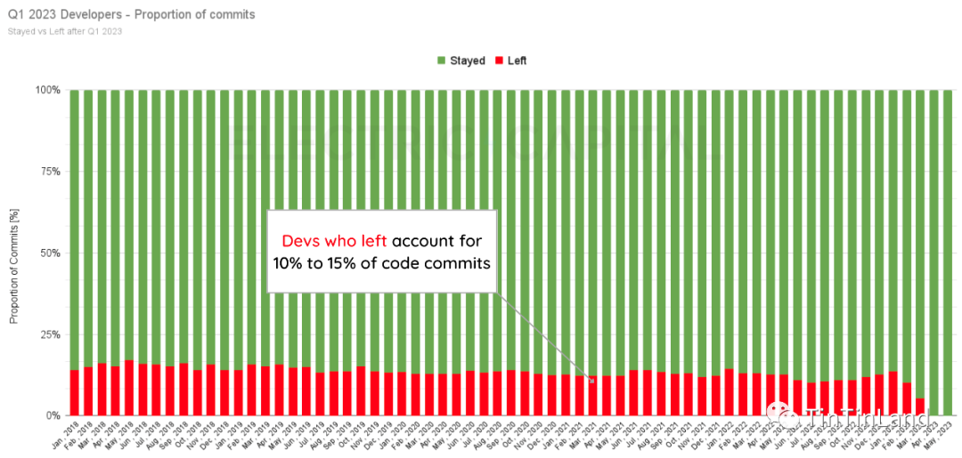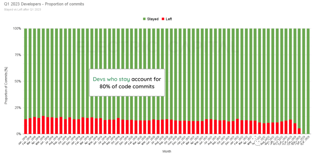 如果开发人员两个月内没有贡献代码,就可以说他们“离开”了。2023 年 3 月之后停止贡献的开发者,仅占历史提交量的不到 20%。