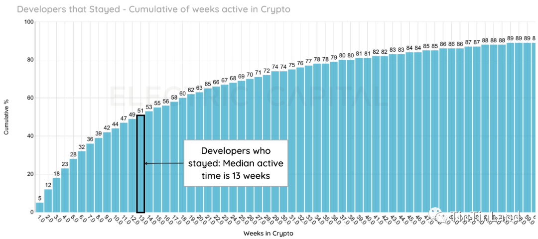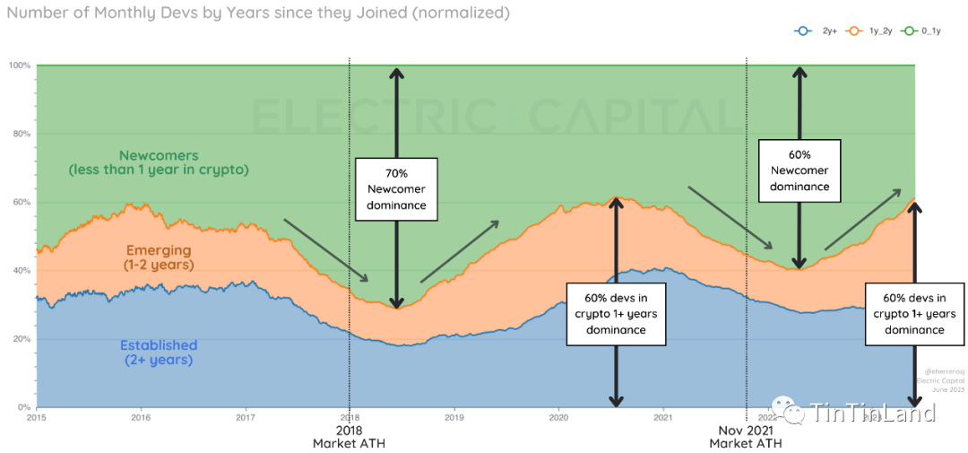 一旦处于熊市,在加密领域工作超过一年的开发人员(新兴和成熟的开发人员)就会占多数: