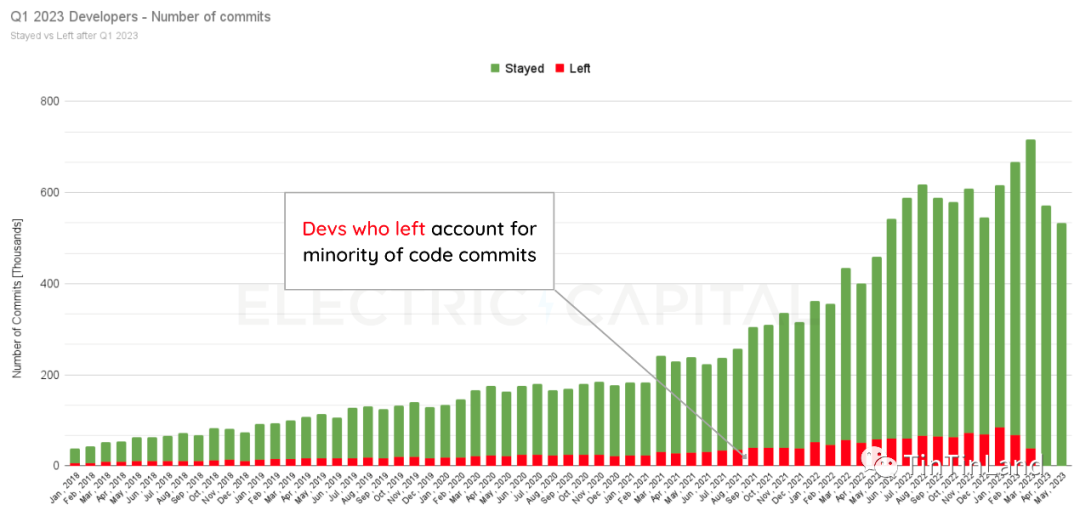 新开发者在 2023 年离开的速度比 2022 年或 2021 年要快,这是熊市的典型现象。
