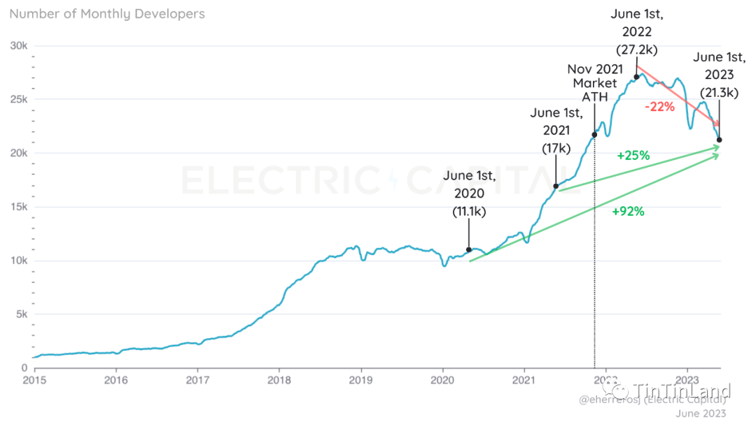 截至 2023 年 6 月 1 日,每月活跃的开源开发者数量为 2.13 万。目前每月活跃的开发者数量比 2021 年 11 月加密市场创下的历史新高还要多。然而,开发者数量在过去一年中有所下降。