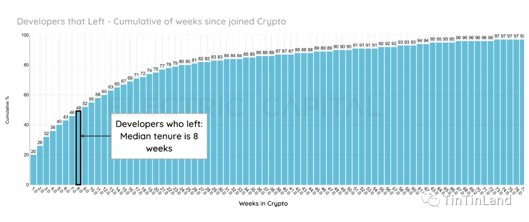 可以将最近离开的开发人员与留下来的开发人员分开,然后细看他们在加密领域的任期曲线图。