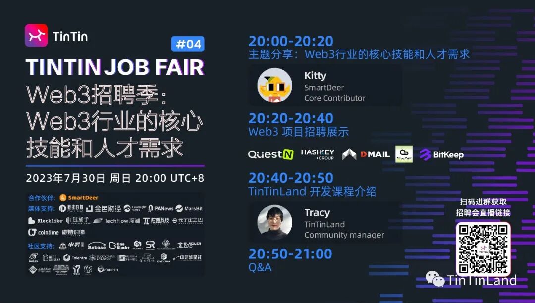 「TinTin Job Fair」 线上招聘会是 TinTinLand 开发者社区为广大学生群体、互联网从业者和区块链开发者们进行区块链行业求职的绿色通道。每期招聘会上,TinTinLand 会邀请各大公链的区域负责人、各大项目方的创始人作为嘉宾一起参会,给求职者分享行业最新最前沿的技术,带来大量的最新岗位 JD,提供一个求职者和应聘方面对面沟通的桥梁。