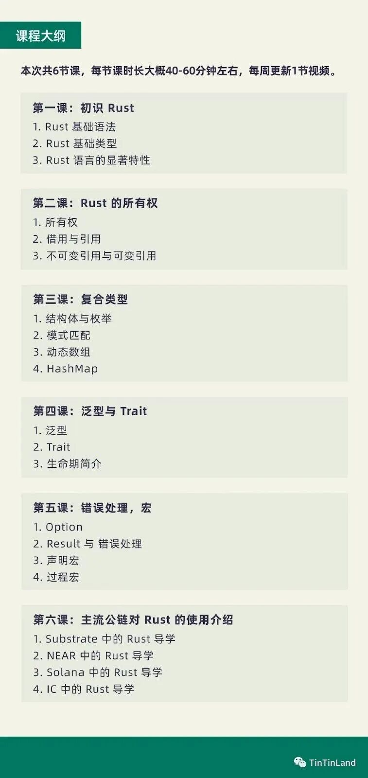 本次课程共 6 节课,每节课时长大概 40-60 分钟左右,每周更新 1 节视频。