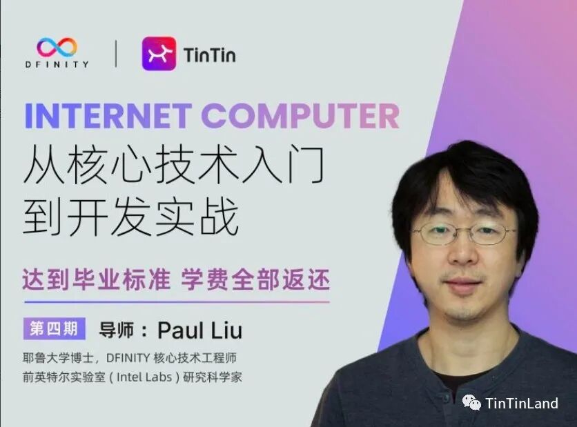 由 TinTInLand 和 DFINITY Foundation 联合打造的「Internet Computer:从核心技术入门到开发实战」已开放第四期的报名通道,该课程由开发经验丰富的耶鲁大学博士主讲导师、DFNITY 核心技术工程师 Paul Liu 担任讲师,是全球第一份DFINITY 实战指南,也是 DFINITY 生态开发者的必修课。