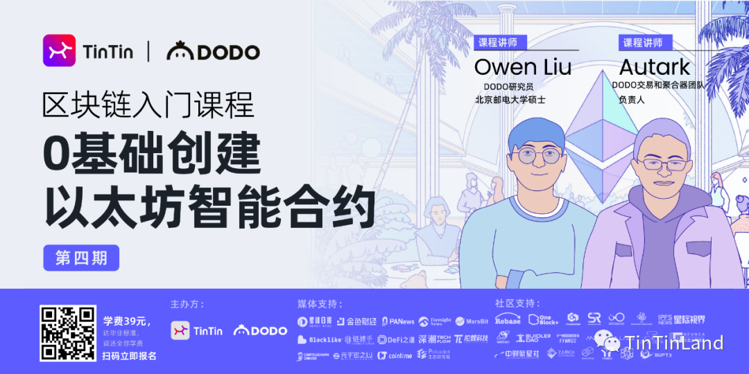 如果你也明确以太坊智能合约技能在区块链开发中的必不可少,了解 EVM 生态在行业中的广泛应用,不要犹豫点击下方链接进行报名吧!该课程由 TinTinLand 联合以太坊知名项目 DODO 开发团队共同推出,前 DODO 合约工程师 Owen Liu、前 DODO 数据团队负责人 Autark 担任讲师,带给你从 0 到 1 创建以太坊智能合约的技能。